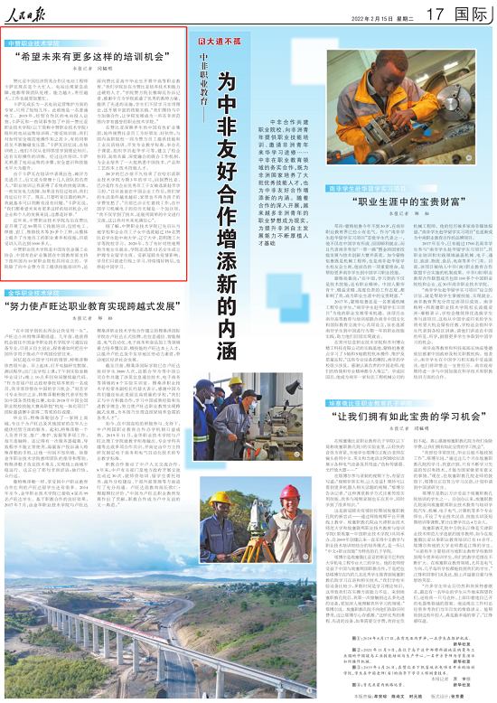 2022年2月15日出版的《人民日報》刊發(fā)題為《中非職業(yè)教育——為中非友好合作增添新的內(nèi)涵(大道不孤)》文章,對中國有色集團(tuán)推動我國職業(yè)教育“走出去”情況進(jìn)行了報道(鏈接:http://paper.people.com.cn/rmrb/html/2022-02/15/nw.D110000renmrb_20220215_1-17.htm)。以下為報道全文: